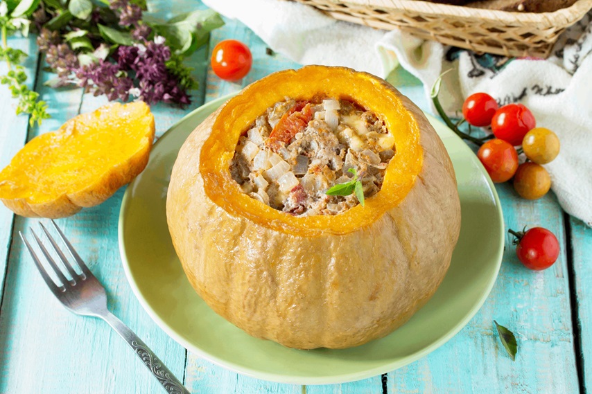Abóbora recheada com risoto de frango